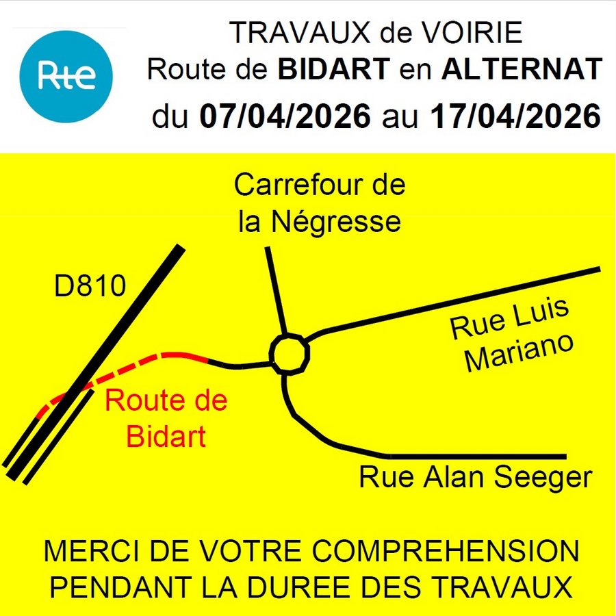 L’entreprise RTE (Réseau de Transport d’Électricité) va mener des travaux sur la route de Bidart sur la bretelle de sortie entre le rond-point Luis Mariano et la RD810 du 7 avril au 17 avril 2026.