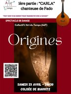 Un spectacle en 2 parties une première partie avec "Carla une chanteuse de Fado" et une deuxième partie avec la création “Origines” des danseurs de l’AdT,…