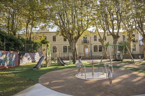 La Municipalité a souhaité compléter les aménagements extérieurs des thermes Salins, en y intégrant de l’art urbain sur le sol du terrain multisports et le mur…